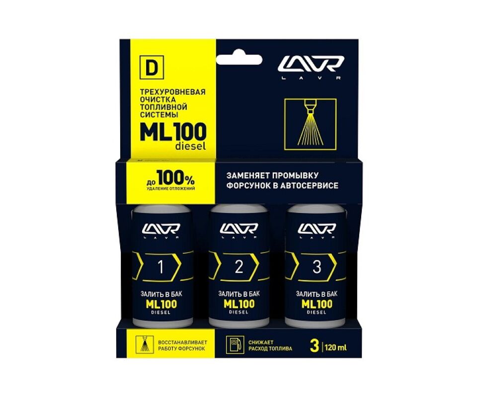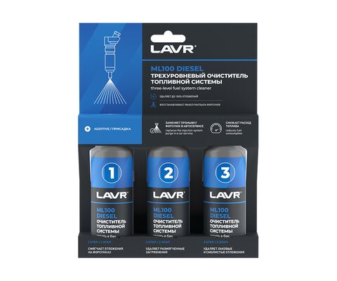 Очиститель топливной системы ML100 DIESEL для дизельных двигателей – это трехкомпонентная присадка для последовательного добавления в топливный бак. Состав №1 удаляет рыхлые загрязнения и нагары на клапанах и форсунках. Состав №2 с запатентованными компонентами LAVR DSP / DET™ выводит лаковые и смолистые отложения из топливной системы. Состав №3 смазывает, защищает от коррозии и появления новых загрязнений. Применяется для всех типов систем впрыска дизельных двигателей.