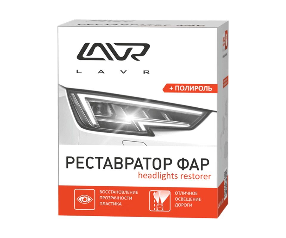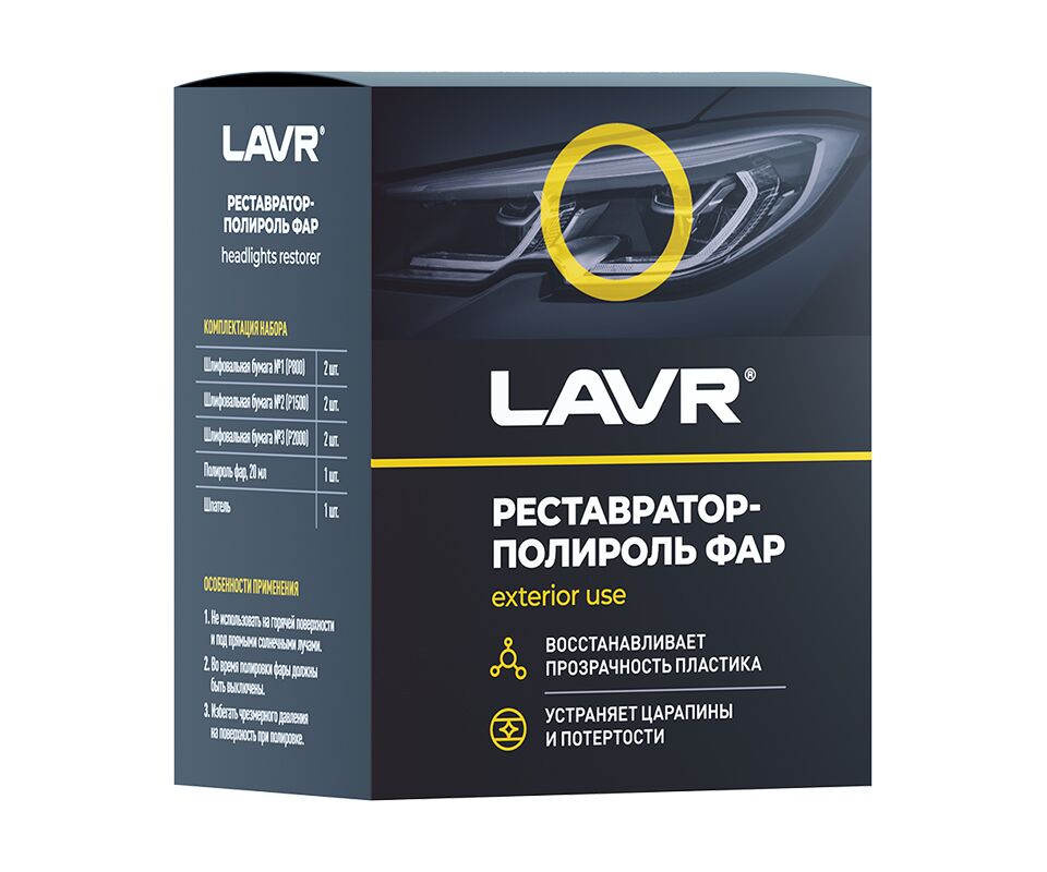 Полироль-реставратор фар LAVR – набор абразивных материалов и финишная паста для полировки пластиковых фар автомобилей. Средство возвращает прозрачность пластиковым фарам, удаляет царапины и помутнения, значительно увеличивает эффективность работы ламп. Особый состав обеспечивает продолжительный результат после полировки.