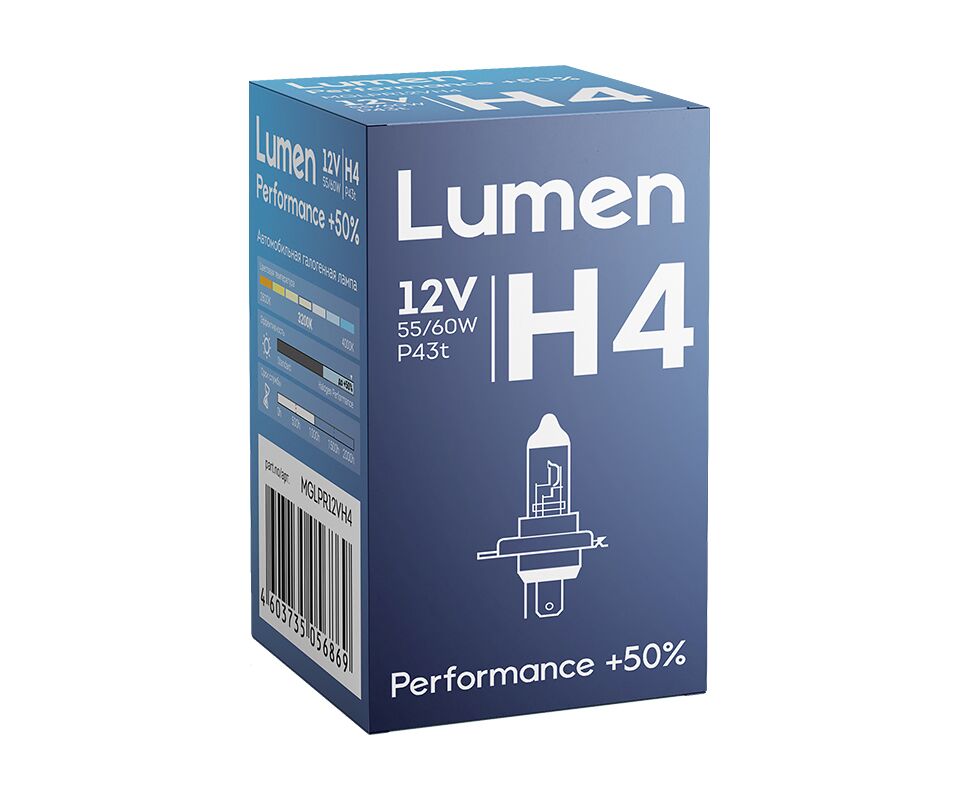 LUMEN Performance +50% H4 12V 60/55W P43t - галогенная лампа головного света с увеличенной яркостью до +50%.