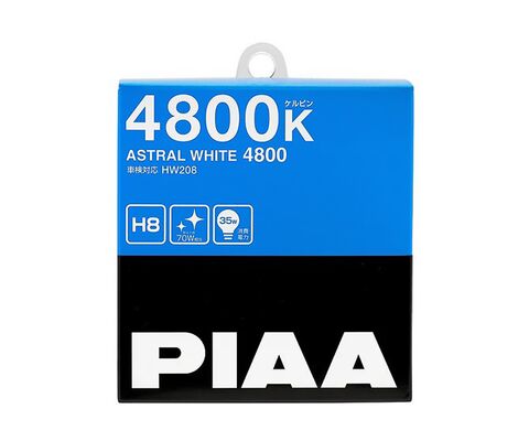 PIAA Astral White H8 12V 35W - галогенная лампа головного света, которая излучает белое свечение цветовой температуры 4800K. При потребляемой мощности в 35W, реальная светоотдача составляет 70W.