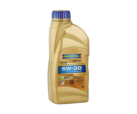 RAVENOL DXG SAE5W-30 – полностью синтетическое моторное масло на основе полиальфаолефинов (ПАО), изготовленное с применением технологий USVO® и CleanSynto® для легковых бензиновых моторов с и без турбонаддува и прямым впрыском топлива.
