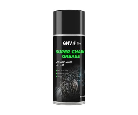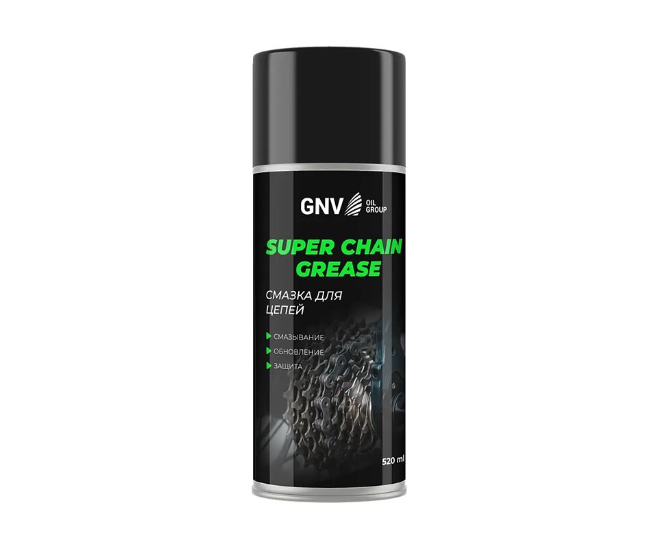 GNV Super Chain Grease – смазка для приводных цепей мото- (вело-) техники (мотоциклов, снегоходов, скутеров, велосипедов и прочих транспортных средств), другой бытовой техники и инструментов, а также любых других цепей, в том числе цепных приводов промышленного оборудования, машин и механизмов. Защищает элементы цепи от износа и существенно увеличивает ресурс работы цепи, снижает шумность работы привода, вытесняет влагу и образует водоотталкивающее покрытие. Специальная базовая литиевая основа и синтетическая присадка на ультрадисперсном порошке PTFE (тефлон) придают продукту высокие антифрикционные и противоизносные свойства.